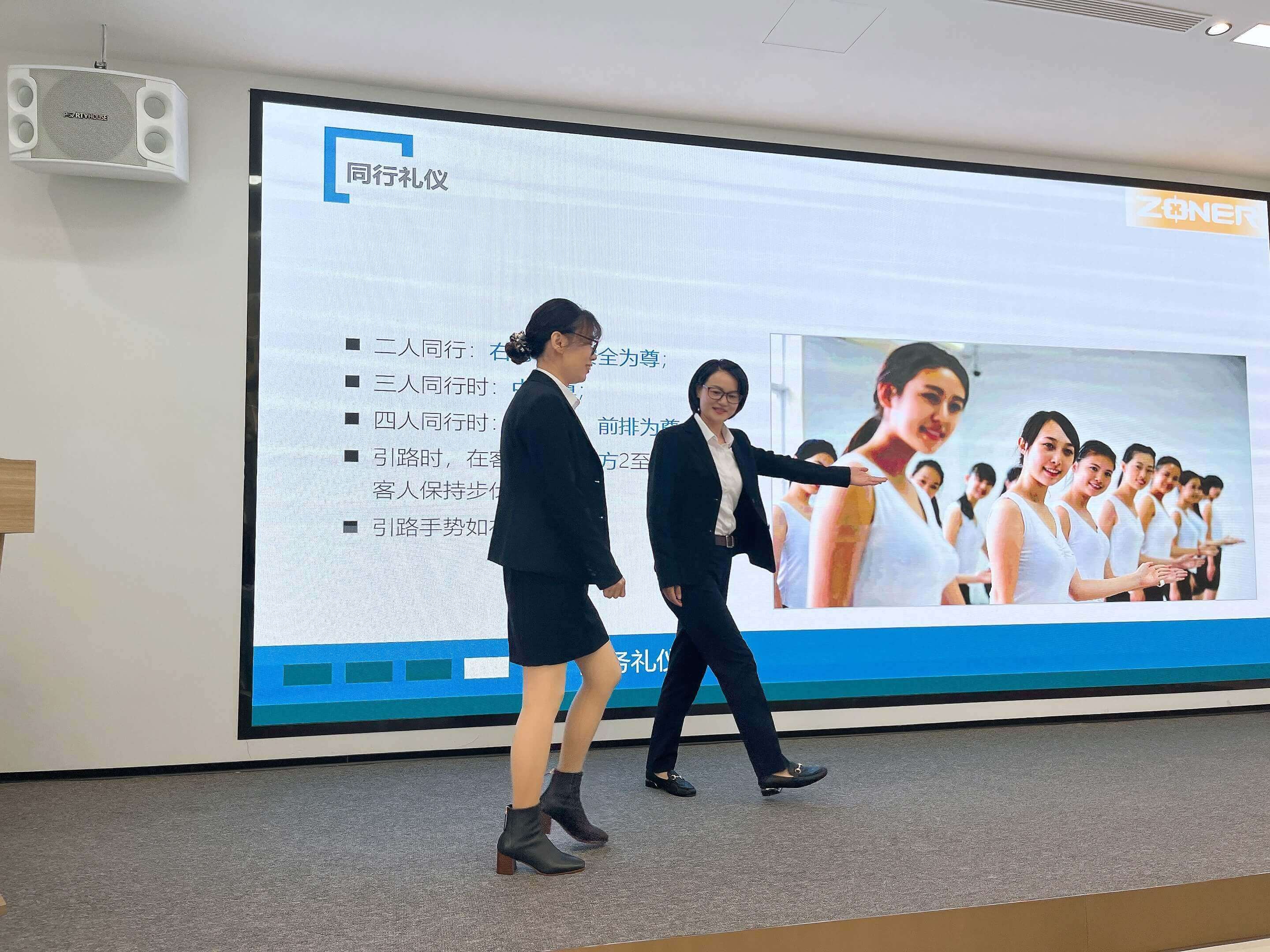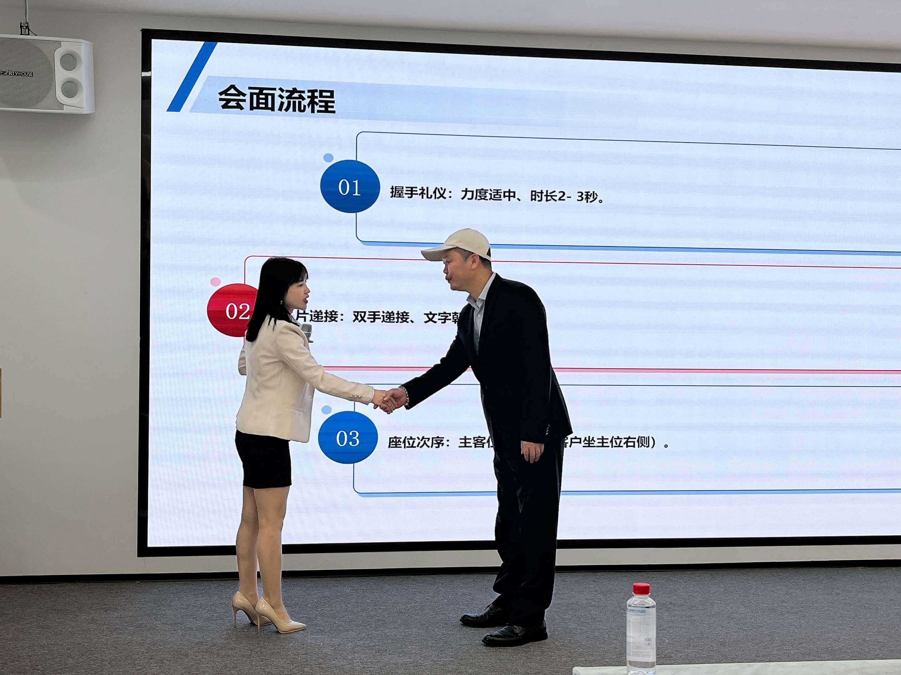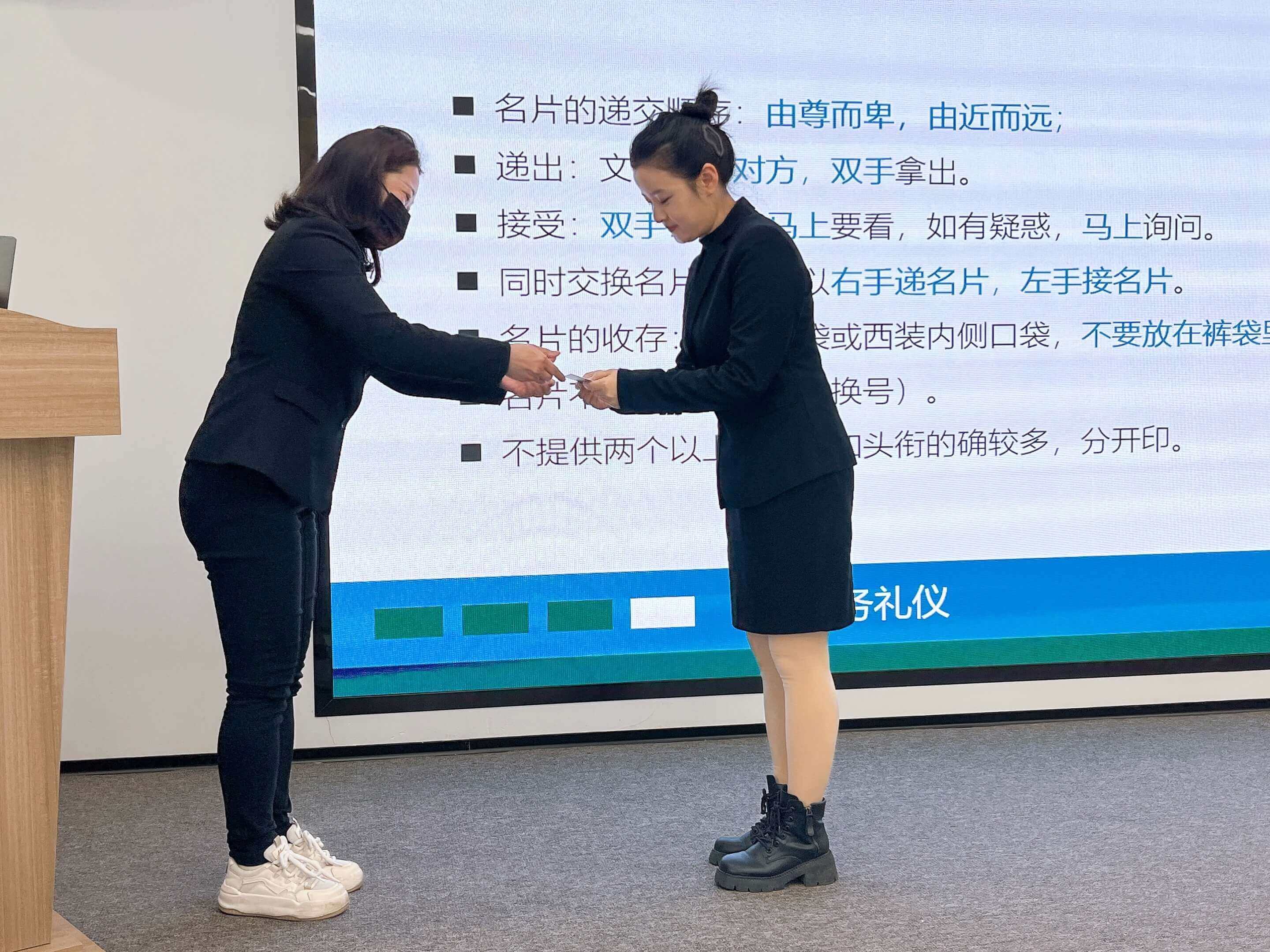 培训中进行了现场问答和现场示范,同事们热情积极参与互动,安排了各种场景模拟环节,通过邀请现场学员上台演示的方式,对握手礼仪、引导礼仪、会场布置等常用场景的礼仪作进一步指导。
